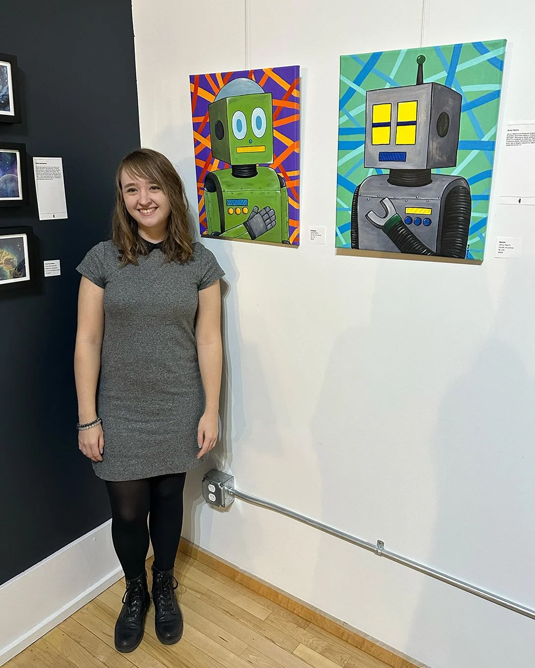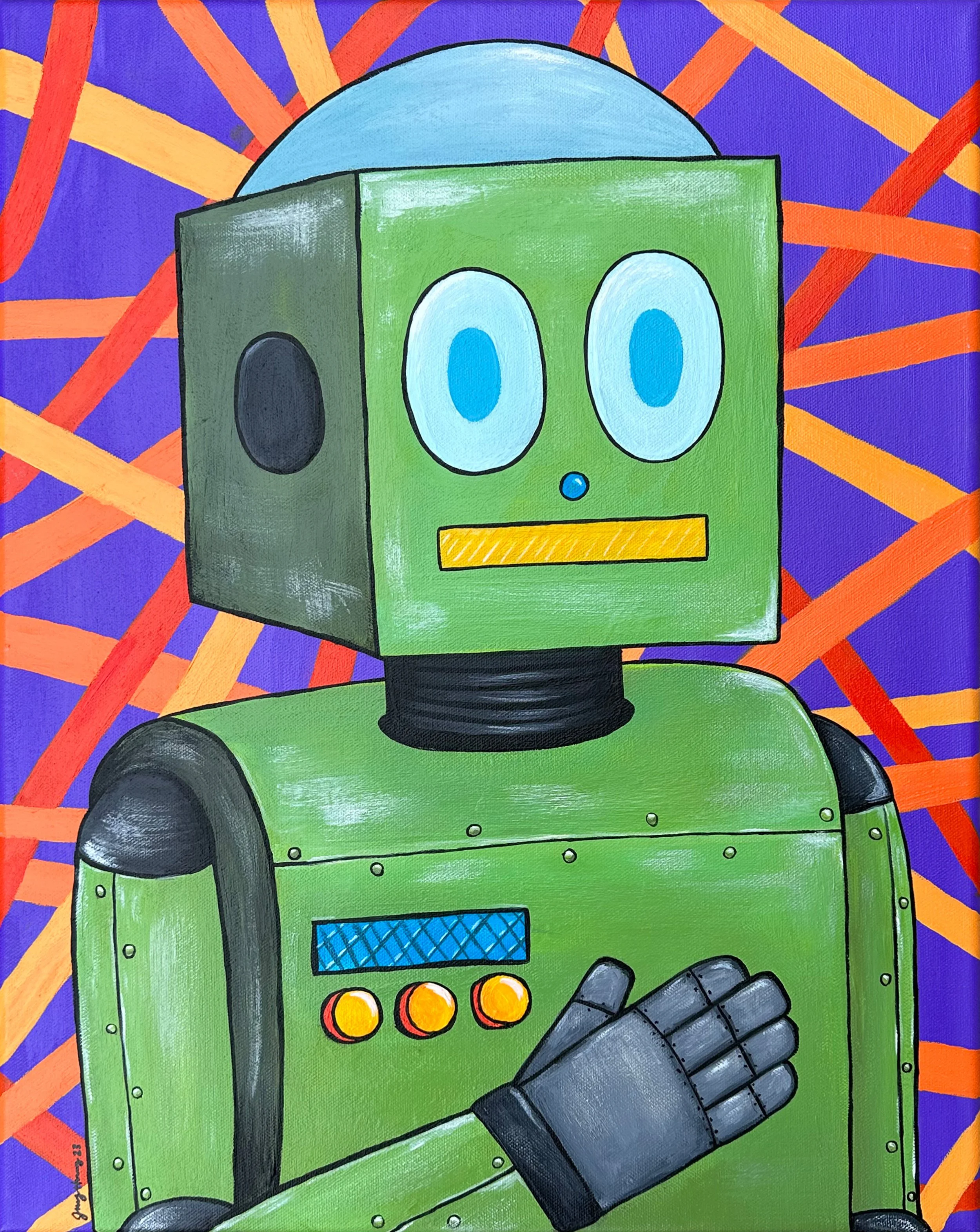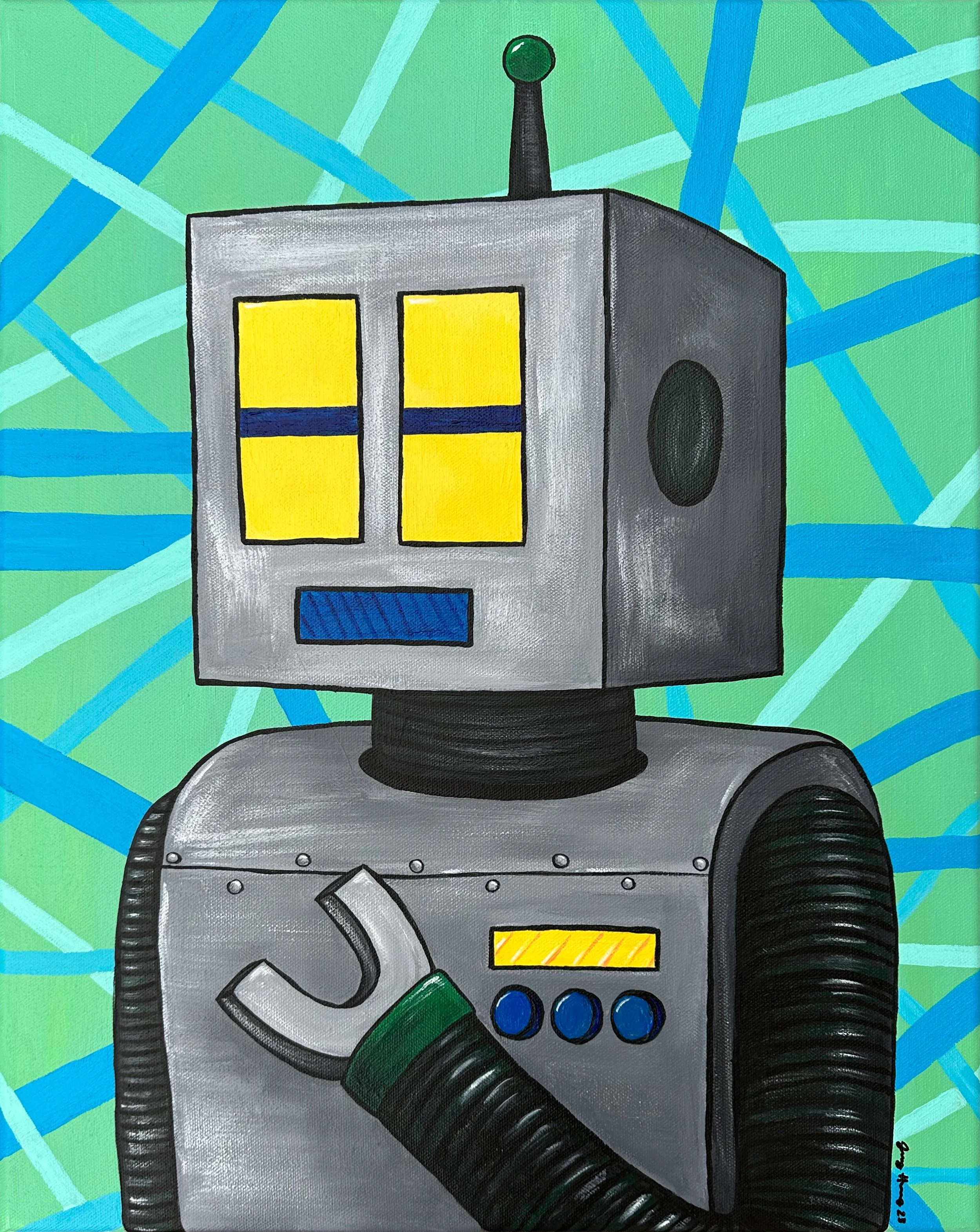 I created these 16"x20" acrylic robot paintings in November 2023 for a nerd-themed group art exhibit at Cocoon Art Space that were on displayJanuary through February 2024.