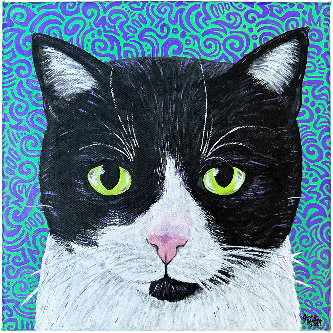 Felinity was a cat-themed group art exhibition at Cocoon Art Space during July and August 2023. These 12"x12" cat portrait paintings were featured in the show. They were created in June 2023 using acrylic and oil-based markers.