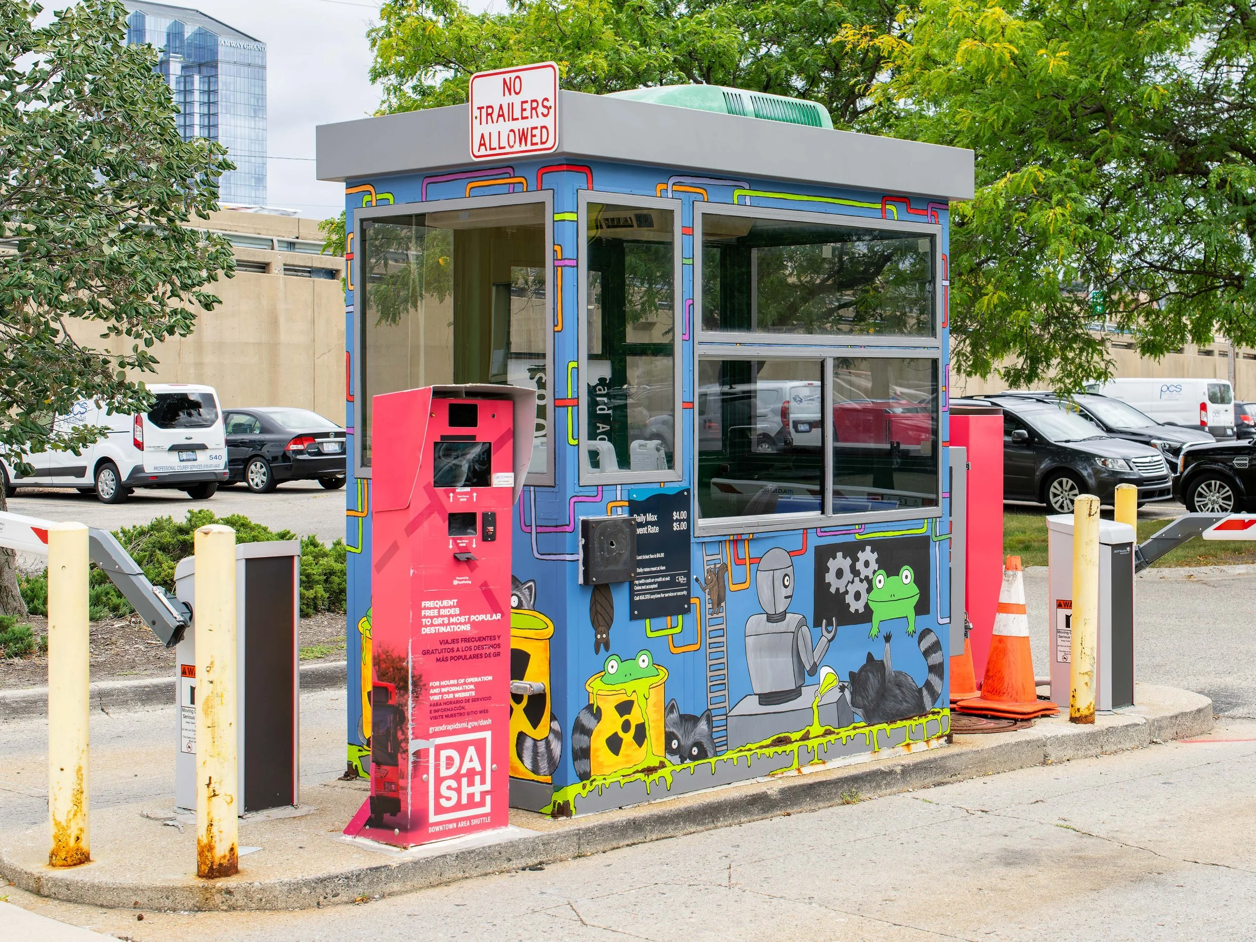 During the summer of 2023, I worked with Downtown Grand Rapids Inc and Mobile GR on transforming one of the city's ticket booths. I was inspired by the rust on the booth to create a visual representation of how I pictured the booth operated. This mural can be found in Dash Lot 7 on the West side, across the street from Service Reproduction.